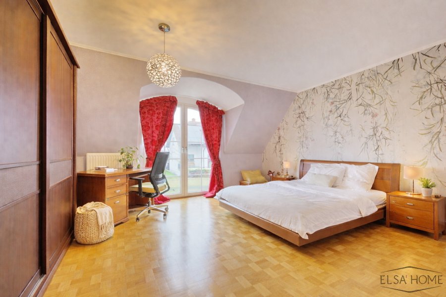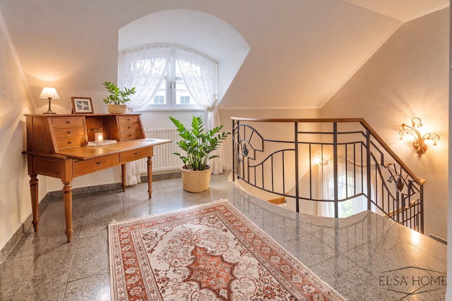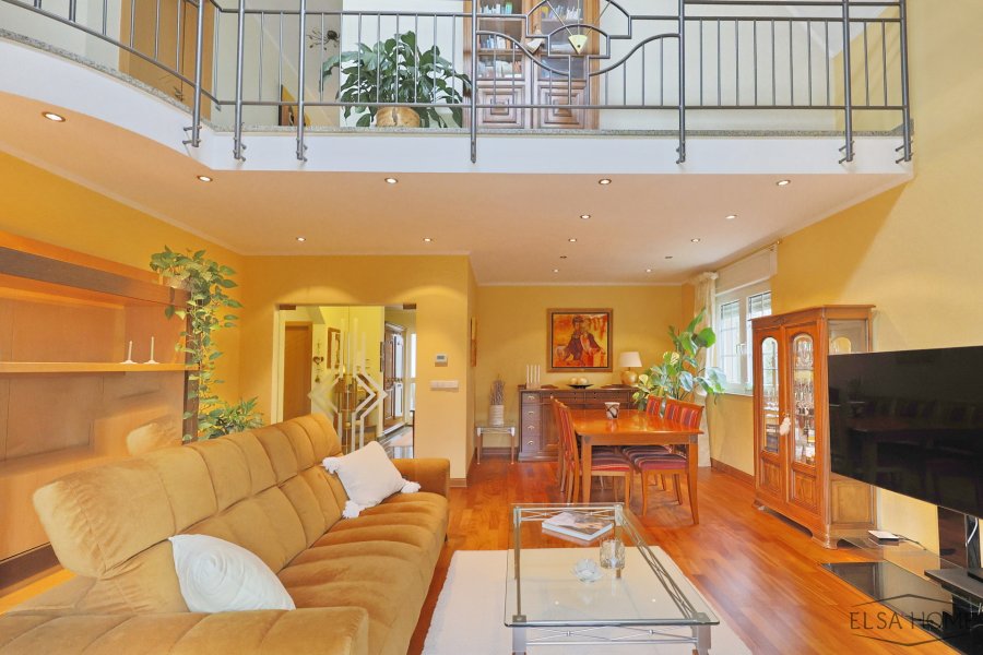 Upstairs, dedicated to rest, a large entrance hall distributes three spacious bedrooms and an elegant bathroom, featuring a mosaic corner bathtub and two large square sinks with built-in cabinets. The mezzanine overlooking the living room provides additional space for relaxation or work.