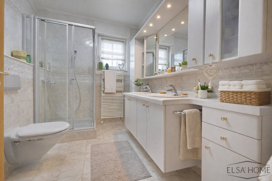 À l'étage, dédié au repos, un grand hall d'entrée distribue trois chambres spacieuses et une salle d'eau élégante, équipée d'une baignoire d'angle en mosaïque et de deux grands éviers carrés avec meubles intégrés. La mezzanine surplombant le séjour offre un espace supplémentaire pour la détente ou le travail.