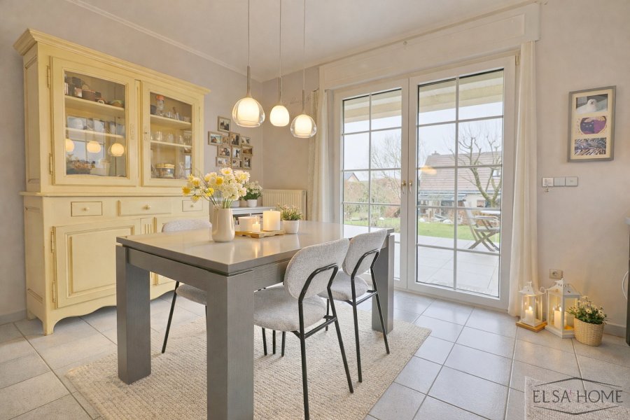 La cuisine séparée, moderne et entièrement équipée, située à l'arrière de la maison, bénéficie également d'un apport de lumière naturelle grâce à ses grandes portes vitrées qui s'ouvrent sur la terrasse et le jardin.